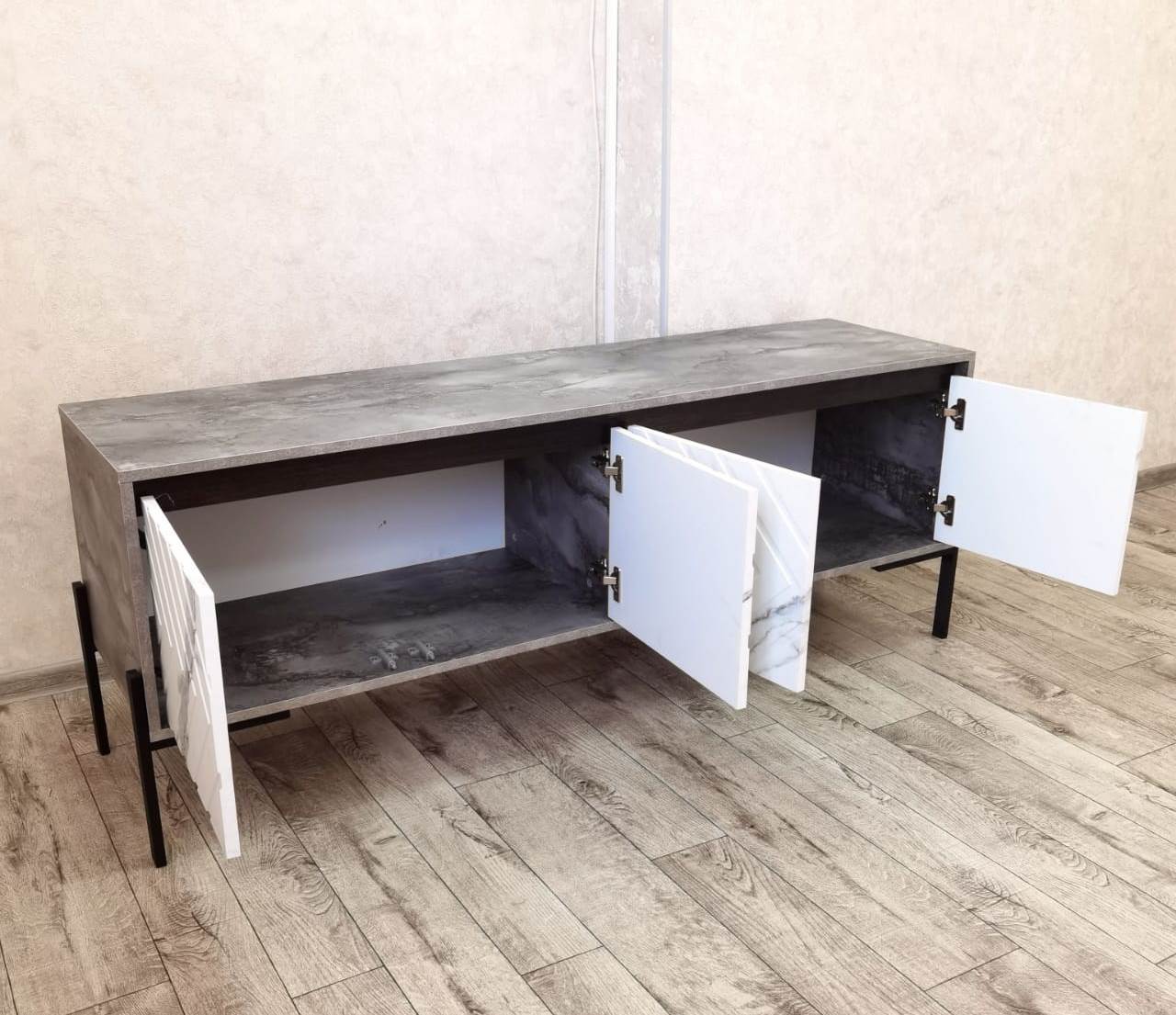 Тумба под ТВ Аллиум-3 дополнит модный лофт или интерьер в индустриальном стиле. Широкая низкая тумба с просторной столешницей и тремя распашными дверцами для хранения сопутствующих аксессуаров предназначена специально для оформления зоны ТВ. Устойчивость, легкость и способность выдерживать большие нагрузки придает тумбе каркас из металлического профиля.